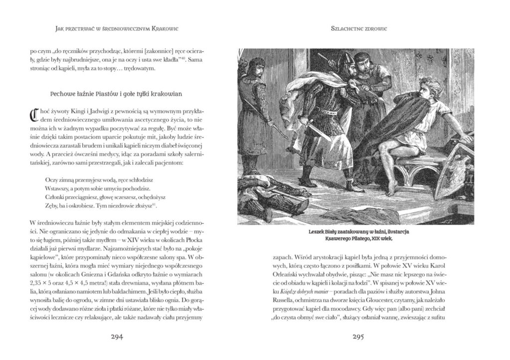 W tym miejscu pewnie zastanawiasz się: “No dobrze, ale ile mnie to będzie kosztować?”. Stawki rynkowe, jakie wydawnictwa oferują współpracującym z nimi redaktorom za ich pracę, rozpoczynają się od kilkuset złotych za arkusz wydawniczy (40 tys. znaków ze spacjami, czyli ok. 22 strony znormalizowane, liczące 1800 znaków ze spacjami). “Jak to, nie za stronę?” Cóż, strona stronie nierówna. Nie każda strona będzie wypełniona tekstem, nie każda będzie napisana tym samym krojem i stopniem, z identyczną interlinią. Niektóre strony (np. ostatnia w rozdziale) mogą się kończyć w połowie, inne – zawierać grafiki albo obszerne przypisy. Spójrz na poniższe dwie strony z mojej książki “Jak przetrwać w średniowiecznym Krakowie?” (wyd. Astra 2017).