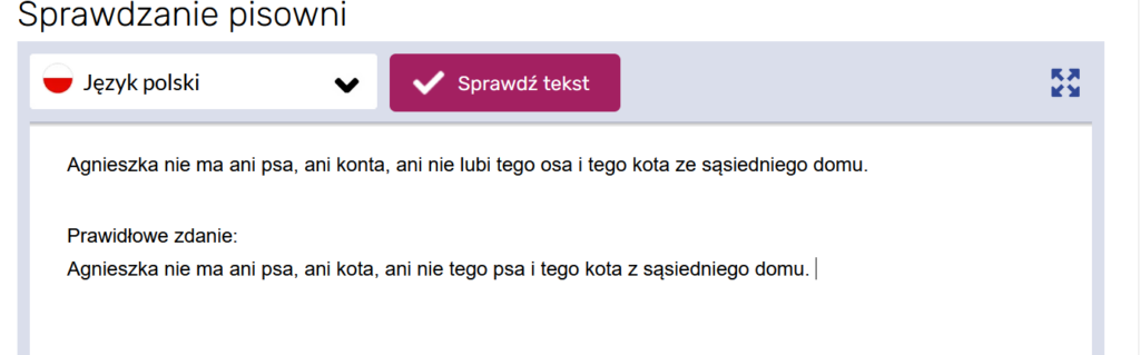 Jeśli mamy do czynienia z mało popularnymi błędami, skomplikowanymi, wielokrotnie złożonymi zdaniami, rozbudowaną składnią, wyjątkami od reguły, podwójnymi spacjami czy literówkami – nie możemy na nim polegać. Przykład? Proszę bardzo, poniżej zrzut zawierający dwa zdania – w pierwszym mamy literówki, zbędne powtórzenia i niezgrabną konstrukcję. Program nie wyłapał przede wszystkim literówek (“konta” zamiast “kota” i “osa” zamiast “psa), reszta problemów nie ma szans na sprawdzenie za pomocą tego typu narzędzi.