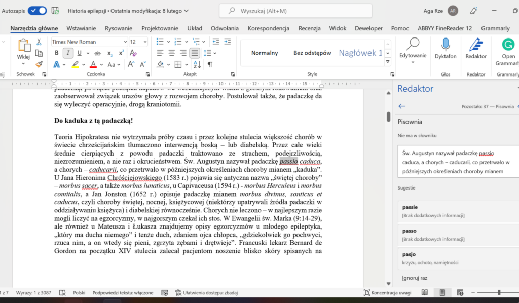 Na początek zacznij od przeczytania – tak po prostu. Nie, nie czytasz historii, nie czytasz powieści, poezji czy sztuki – czytasz tekst. “Wyłącz” tryb autora (jeśli nie potrafisz tego zrobić albo nie znajdujesz w tekście żadnych usterek – to wyraźny sygnał, że potrzebujesz do tego profesjonalisty). Najwygodniej robić to na wydruku, choć zużycie ryzy papieru i całego pojemnika tuszu, że o prądzie nie wspomnę, również wiąże się z kosztami. Niestety, czytanie na ekranie komputera przebiega bardziej “automatycznie” i łatwiej przeoczyć literówkę czy błąd. Następnie ten sam tekst sprawdź za pomocą narzędzi wspierających pracę z tekstem, takich jak “Redaktor” w programie MS Office. Nie jest to, niestety, narzędzie idealne, co pokażę na przykładzie poniżej. Na zrzucie z ekranu widać tekst mojego artykułu o historii rozumienia i leczenia padaczki, który pojawił się kilka miesięcy temu w serwisie “Medycyna Praktyczna”.