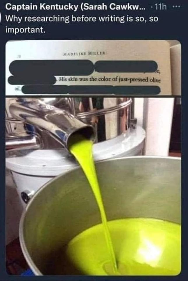 Być może większość z nas nie zwróciłaby na to uwagi, ale czytelnik, który wrzucił powyższe zdjęcie, najwyraźniej jest zawodowo związany z branżą oliwną (to jest ten “najgorszy scenariusz”, o którym pisałam wyżej). Taki opis zapewne go rozbawił lub zdenerwował, co potwierdza tekst nad zdjęciem. Cóż, zapewne niewielu z nas miało okazję obserwować proces wytwarzania oliwy, więc szanse na to, że ktoś “przyczepi się” akurat do tego fragmentu były niewielkie. Jednak mem rozszedł się na tyle szerokim echem, że dotarł do autorki powieści, która we wpisie na Twitterze wyjaśniła motywy użycia metafory w następujący sposób: